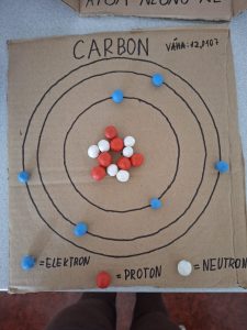 Se spolužáky jsme při hodině fyziky vyráběli model atomu helia. Model jsme vyráběli ze železného kruhu, který jsme upravili, aby vypadal jako atom. Potom jsme z papíru vyrobili 2 protony 2 neutrony a 2 elektrony, které jsme barevně natřeli temperami. Vyrábění nás bavilo.