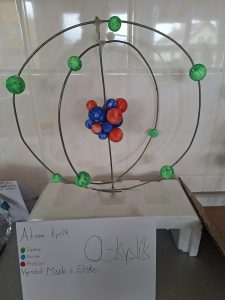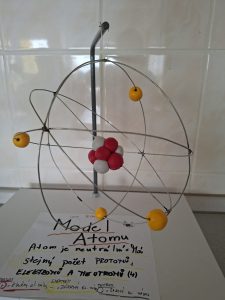 Model atomu jsem vyráběl s kamarádem Martinem. Náš druh atomu byl titan. Použili jsme tři železné obruče, každá měla jinou velikost. Do středu jsme dali polystyrenovou kouli a na ni jsme přilepili červené a bílé kuličky – to bylo jádro atomu. Na obruče jsme připevnili modré kuličky, které představovaly elektrony.