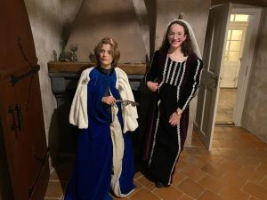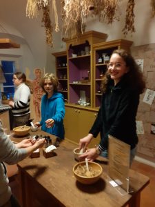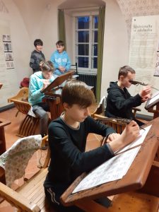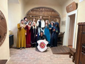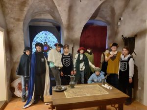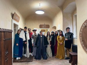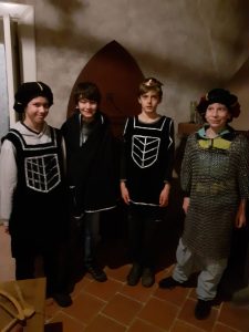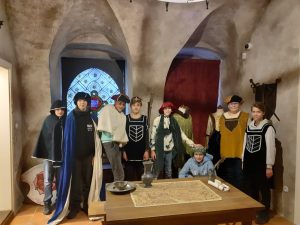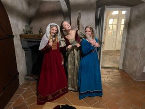 Nakonec jsme navštívili hlavní cíl naší exkurze – kláštery, kde jsme se opravdu přenesli do středověku. Viděli jsme, co se nosilo, jedlo, pilo a jak lidé bydleli. Rozdělili jsme se do dvou skupin, první si vyzkoušela některá řemesla, jako např. výrobu svíček, purpury, pohledů nebo psaní husím brkem. Druhá skupina si mezitím zkusila, jaké je to být alchymistou, nebo se stát členem středověké společnosti a obléct si dobové kostýmy. Skupiny se potom vystřídaly. Podívali jsme se i na půdu, kde můžete vidět třeba tanec smrti, nebo velký model města.
